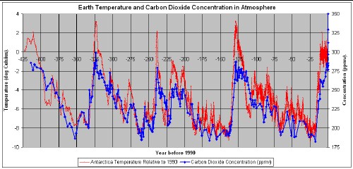 Temperature and carbon dioxide (CO2) atmospheric concentration have been measured for ice cores at Vostok, Antarctica for the last 423,000 years: