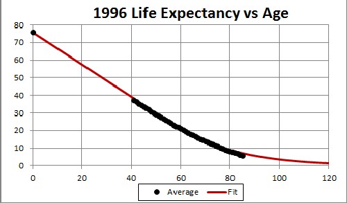 Of course, life expectancy decreases as one's age increases. The following graph is a fit of a tanh to the data for 1996: