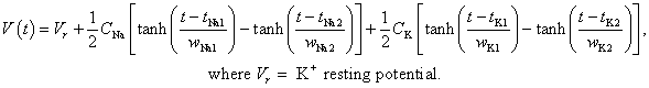 If more ions are involved with channels opening, such as Ca ++, they can be added as another double hyperbolic tangent.