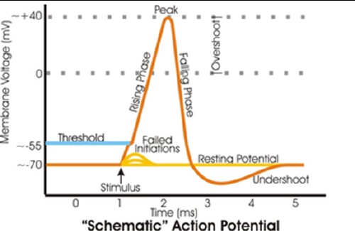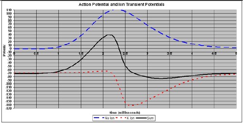 A typical action potential (inside relative to outside) is shown in the graph below.