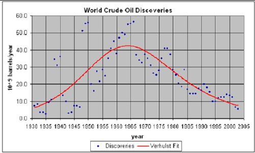 The graph below shows crude oil discoveries rate. Note the peak in discoveries at about 1965 and the rapid fall since about 1975. The Verhulst function fit (Roper, 1976) to the discoveries data gives the total amount of crude oil to be extracted as slightly less than 2 x 10 12 (2 trillion) barrels. Obviously, World crude oil discoveries have been meager and declining for the last thirty years.