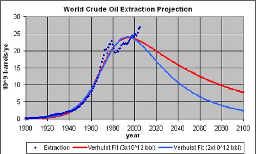 The graph below shows the World crude oil extraction rate and two mathematical fits to the data. The two Verhulst-function fits (Roper , 1976) were obtained by fixing the total amount of World crude oil to be extracted at 2 x 1012 (2 trillion) barrels, an amount consistent with the fit to World crude-oil discoveries discussed above and at 3 x 1012 barrels, 50% more than the amount that fits the discoveries-rate data.