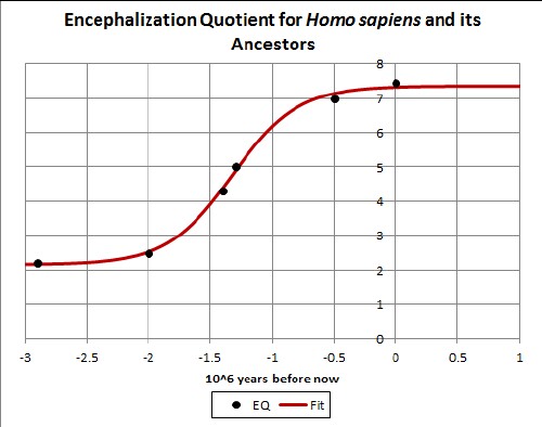 A possible measure of human intelligence evolution is brain-to-body mass ratio, called the encephalization quotient (EQ). Here is an hyperbolic-tangent fit to the rough data: