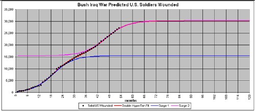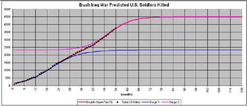 The Bush Iraq War had two “surges” of United States troops involved from its beginning in March 2003 to the end of 2007. Those two surges are very well fitted by two hyperbolic tangent functions as shown in the following graph: