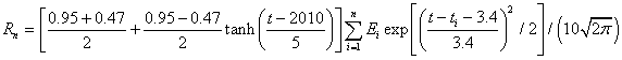 Recycling of the mineral extracted in a specific year, ti, is not recycled until some later year. If fact, it is spread out over a range of years. That spread is assumed to be a Gaussian function centered at some later year, ti + tp with width wp. The total recyling function for year t after initial year t0 is: