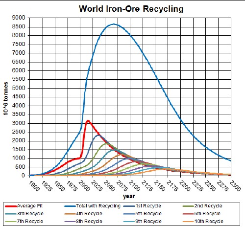 One has to make reasonable guesses about the values to use for the parameters for a given mineral. Here is a calculation for iron-ore extraction and recycling: