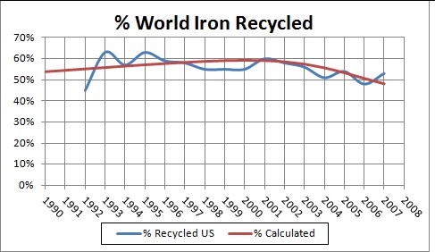 The parameters in the recycling equation above were determined by fitting the iron/steel recycling data for the United States, thereby assuming that the world recycling rate was similar:
