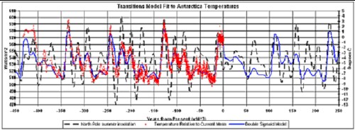 This is a fit to Antarctica temperature data for the last four Major Ice Ages by a mathematical function involving the North-Pole summer insolation and two Earth-states transitions in the time vicinity of the five Major Interglacials (Roper, 2004). The fit is then projected into the future for the next two Major Ice Ages. The bottom graph shows the two Earth-states transitions and their sum (solid curve).