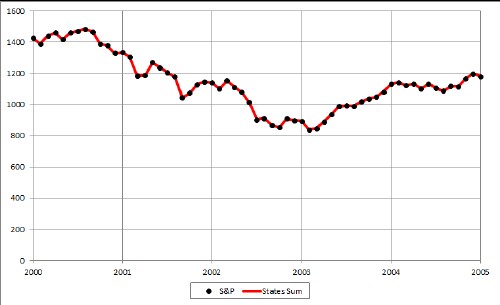 The Standard and Poor's representation of the United States stock market can be represented as a sum of many states' changes using the hyperbolic tangent. Here is an 50-hyperbolic-tangent fit to date between the years 2000 and 2005:
