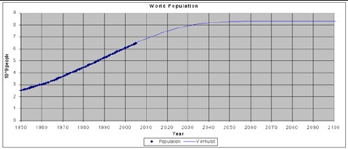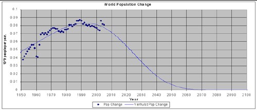 It appears that World population growth is beginning to decline. The ideal situation would be that it would approach an asymptote rather than continuing to grow exponentially or disastrously decline by terrible calamities. A Verhulst function can be fitted to the data since 1950 to yield the curves shown in the following graph.