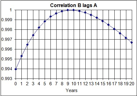 So, B lags A by about 9.5 years, because A was changed first. If B were changed first, A would lag B by the same number of years for a symmetrical mutual interaction. Therefore, two variables that mutually interact symmetrically to give mutual-positive feedback will lead or lag each other by the same number of time units depending on which one is changed first after a steady state situation.