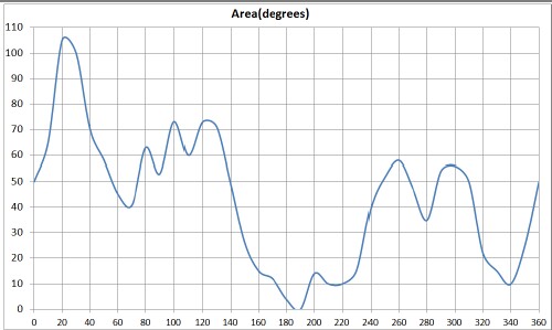 It is interesting to compare the following graph of approximate land area (in latitudinal degrees) to the curves given above: