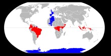 Countries on the Prime Meridian are blue and countries on the Equator are red.