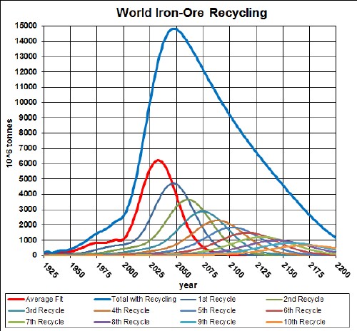 Not only do fossil fuels deplete but also other industrial minerals deplete. Many industrial minerals can be recycled, but the Second Law of Thermodynamics (Law of Increasing Entropy) demands that some is chaotically spread over the planet at each recycling. For example, some reasonable assumptions about iron depletion and recycling yield: