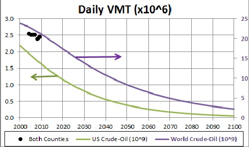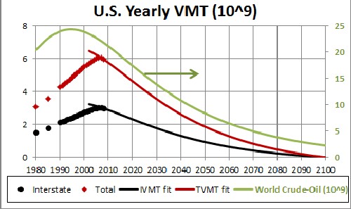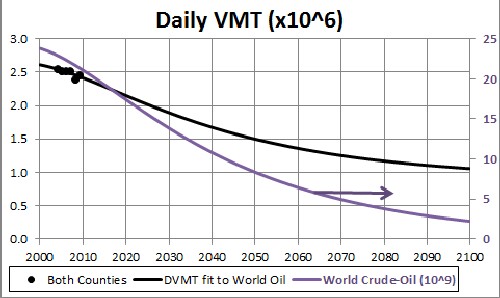 I have done linear fits of VMT data to the average world crude-oil extraction to give a rough projection of future VMT.