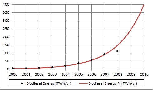 Probably the best renewable fuel for the future is biodiesel. For the reasons see Pahl (Pahl, 2008). Using data taken from Renewables: Global Status Report, the graph below shows the biodiesel-production history data for the world, most of which has been in Western Europe, and a mathematical fit to the data to use for projection into the future.