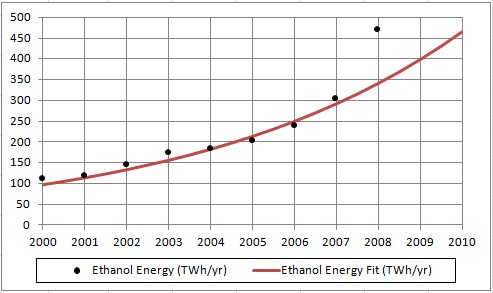 Using data taken from Renewables: Global Status Report, the graph below shows the ethanol-production history data for the world, most of which has been in Western Europe, and a mathematical fit to the data to use for projection into the future.