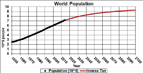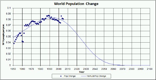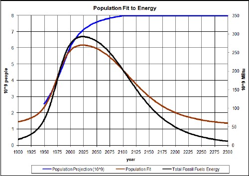 One can make a good case that world population is proportional to the availability of fossil-fuels energy. I have fitted world population from 1950 to 2006 to available fossil-fuels energy and projected it into the future: