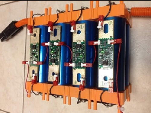 There are six battery modules with 18 pairs of 10-Ah LiFePO4 batteries (Headway HW-38120S) in each module, for a total of 108 pairs or 216 batteries. Each module has ~58-volts and 20-Ah, so the total voltage for all six modules in series is ~348 volts. Therefore, the maximum energy stored is ~7.2 kWh. Each battery module weighs 33 lbs, with a total battery-pack weight of 198 lbs.
