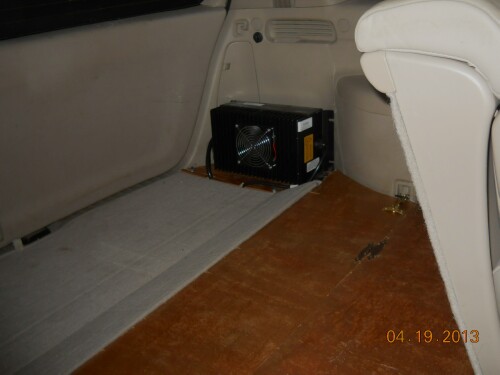 The six modules are placed in two layers of three modules in the 3rd-row seat's well. The pack is secured to the vehicle by four straps attached to the 2nd-row seat base in front and by Velcro between the bottom front battery and the rug below it and between the modules::