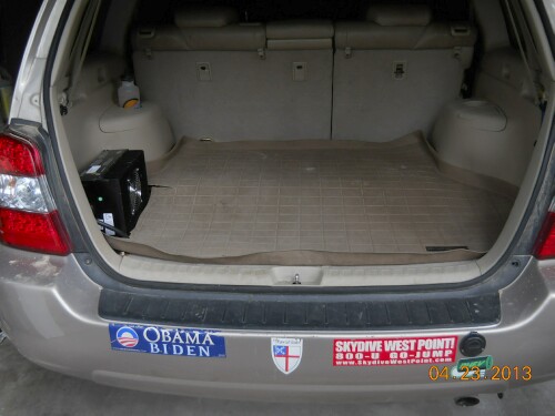 A Weathertech cargo liner is on top of the cargo area for protection from liquid spills and mud.