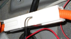 Its OBDII cable is run under the dash to plug into the OBDII receptacle very near the foot-actuated emergency brake. In fact, a foot can easily unplug the OBDII cable, so two plastic ties hold the cable onto the receptacle:
