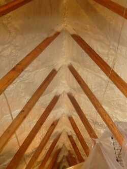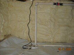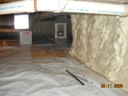 The 6-mil thick polyethylene on the floor laps about a foot up the sides before the open-cell foam is sprayed on the walls. It also laps up any interior supports.