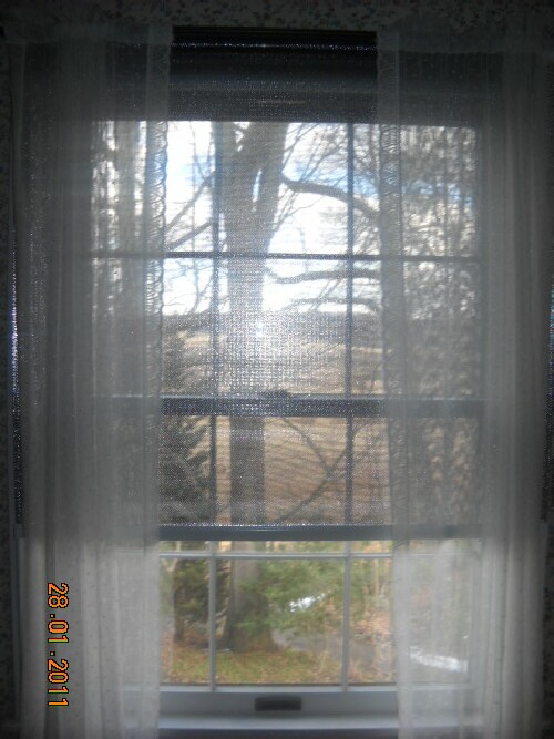 The left picture shows both sides of a fixed shade. The right picture shows a roller shade 2/3rds of the way down in the winter position. It can be turned around for summer. |