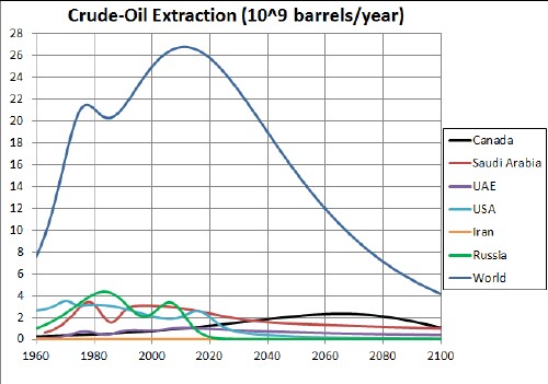 The blue curve in the first graph above probably is a maximum representation of the future of crude-oil extraction in the United States. The last peak of the blue curve could be higher but narrower or lower but wider. Thus, it appears that the extraction of crude-oil in the United States will peak before 2025 and then fall rapidly.