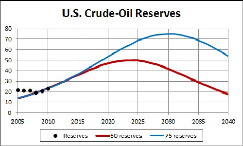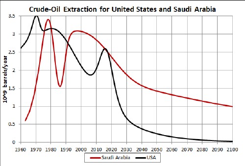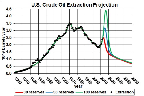 If the U.S. reserve value is 50 x109 barrels, U.S. extraction may exceed Saudi-Arabia extraction for a brief period at ~2015.