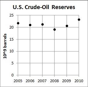 The U.S. Energy Information Administration gives data for extraction rates and current estimated reserves for crude-ol extraction in the United States. The 2010 estimated reserves value for crude oil is 23.267 x 109 barrels.