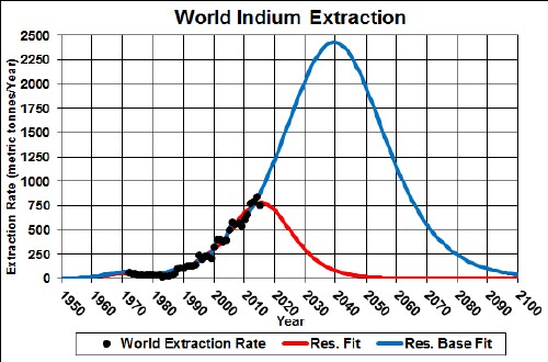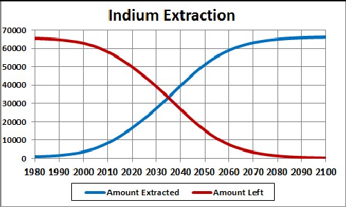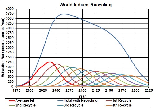 Thus, under the assumptions given above, the effective amount of indium available for making items peaks at about year 2020 and falls off rapidly after that. Humans will have taken concentrated indium deposits and scattered them across the surface of the earth.