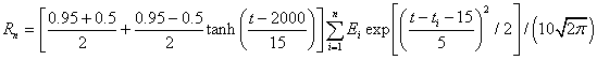 {=(($J$2+$I$2)/2+(($J$2-$I$2)/2)*TANH((A27-$K$2)/$L$2))*SUM($I$27:I27*(EXP(-1*((A27-$A$27:A27-$N$2)/$O$2)^2/2))/$O$2/SQRT(2*PI()))} (The curly bracket surrounding the term makes it into an array; it must be entered by holding down the SHIFT & CTRL keys while pressing the ENTER key.)