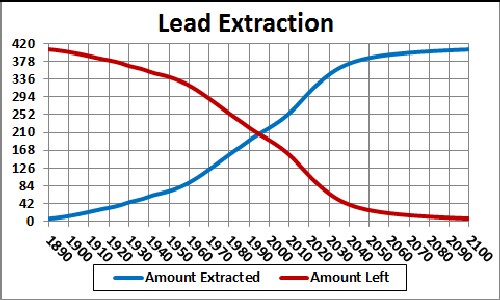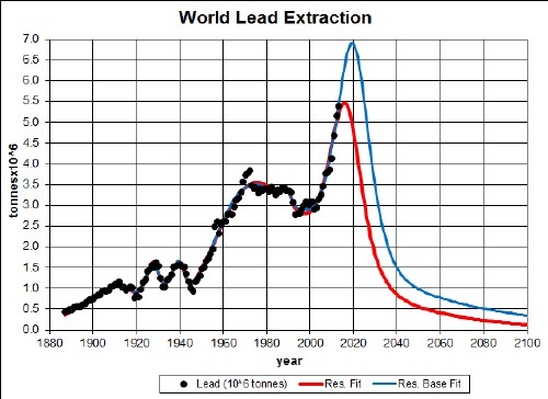 The graph below shows the lead extraction data for the world and two Verhulst function fits to the data in order to extrapolate into the future:.