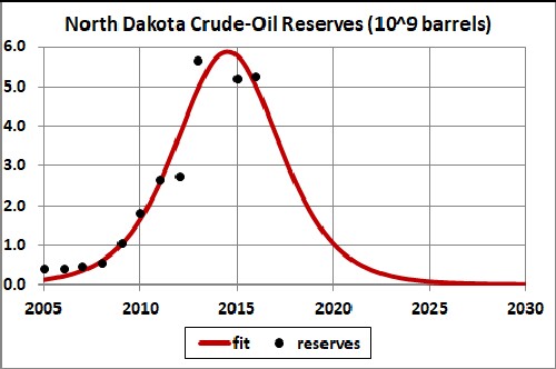 The U.S. Energy Information Administration gives reserves estimates from 1977 to 2011 for crude-oil extraction in North Dakota, which are shown here by black dots for years 2005 to 2011: