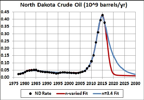 Then a Verhulst fit was done to the North Dakota tight-oil extraction data with the asymmetric parameter fixed at 3.4: