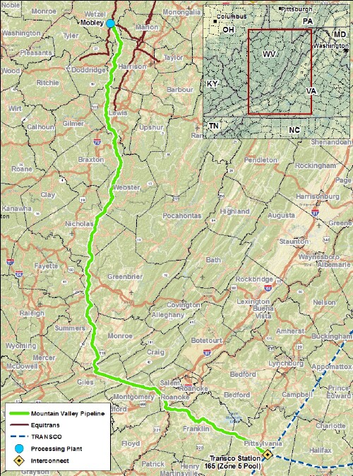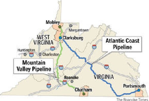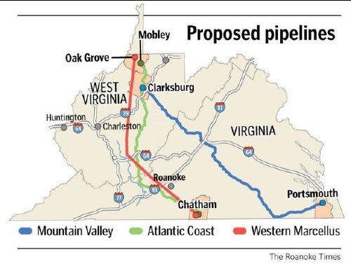 Note in the two maps above that the proposed Mountain Valley pipeline connects to a pipeline in Pittsylvania Co. VA that continues on to the Norfolk area on the coast. It appears that a main reason for the pipeline is to take natural gas to the coast of Virginia where it could be liquefied (LNG) and exported.
