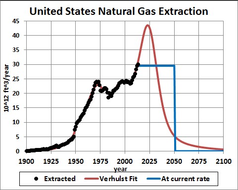 The red-curve fit to the extraction data uses a high value for reserves (1352 trillion cubit feet) and assumes that the final peak is symmetric. The blue lines show when the reserves would run out (~year 2050) if the future yearly extraction rates were the same as for 2013.