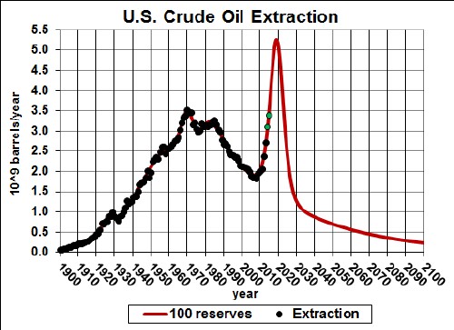 The red-curve fit to the extraction data uses a high value for reserves (100 billion barrels) and assumes that the final peak is symmetric.
