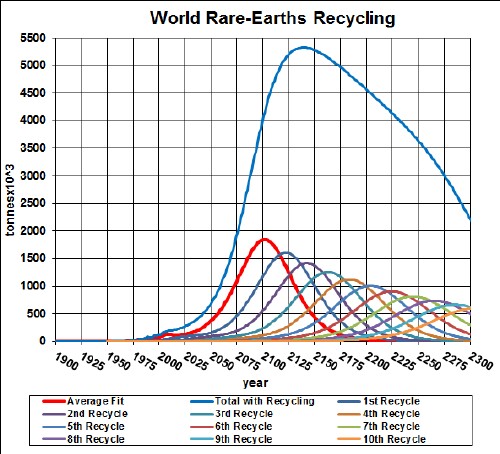 Thus, under the assumptions given above, the effective amount of rare earths available for making items peaks at about 2070 and falls off rapidly after that. Humans will have taken concentrated rare earths deposits and scattered them across the surface of the earth.