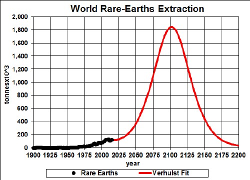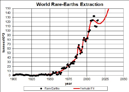 The fifteen Rare Earths (Lantham, Cerium, Praseodymium, Neodymium, Promethium, Samarium, Europium, Gadolinium, Terbium, Dysprosium, Holmium, Erbium, Thulium, Ytterbium & Lutetium) are used to make many modern technological devices, including magnets. The graph below shows the rare.earths extraction data for the world and a Verhulst functions fit to the data in order to extrapolate into the future.