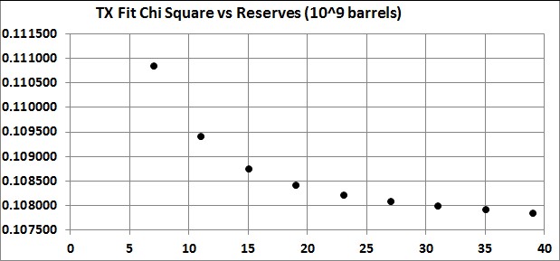 It is interesting to plot the chi square for the fit, which is a measure of the goodness of the function's fit to the extraction data, versus 9 reserves values::