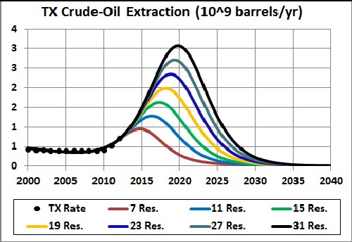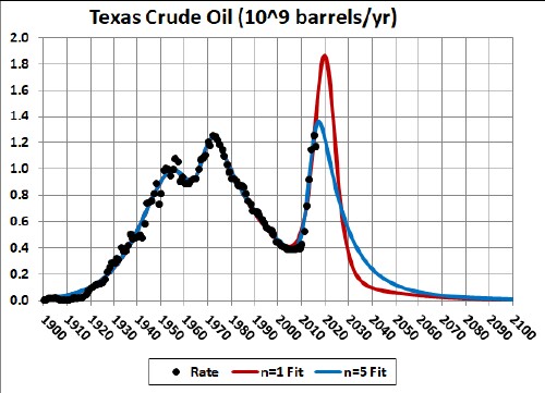 The depletion curve for crude-oil extraction for Texas has essentially three peaks; so N=3 in the depletion equation. The fit to the extraction data using the reserves peak, ~10.5 x 109 barrels, given in a previous section is: