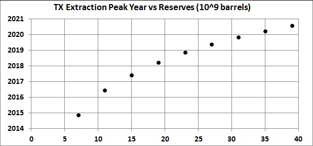 This has a logarithmic behavior as expected mathematically. That is, the rise in the peak year increases much less than linearly with the rise in reserves.