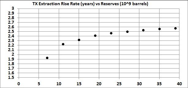 The exponential rise rate approaches ~2.6 years as the reserves values get larger. This is a fast rise rate!
