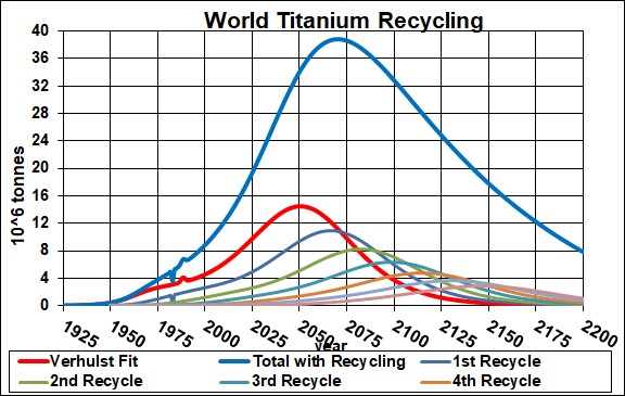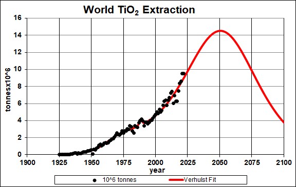 The graph below shows the titanium extraction data for the world and two Verhulst function fits to the data in order to extrapolate into the future.