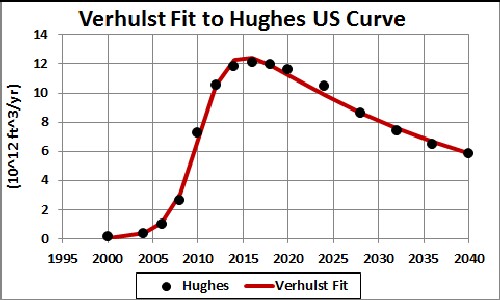 I fitted a Verhulst function to the Hughes combined seven largest shale-gas plays curve to get the asymmetric parameter n: