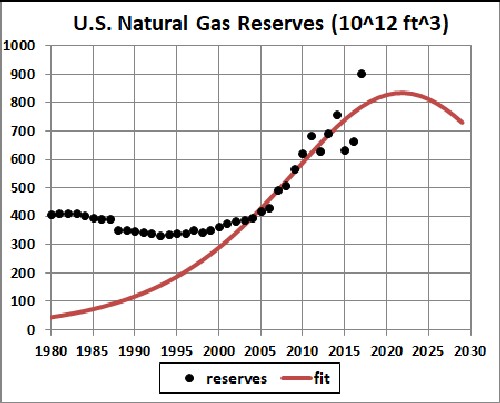 The curve is a fit to the 10 EIA reserves estimates from 2005-2013 using the Verhulst function described in the next section, assuming that the curve will be symmetrical. The fit is done to get a rough estimate of the peak value of the reserves estimate in the future, which is ~900 x 1012ft 3.