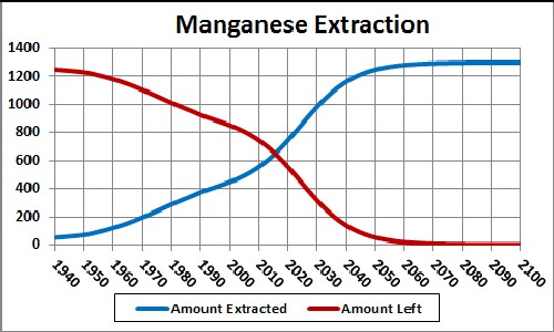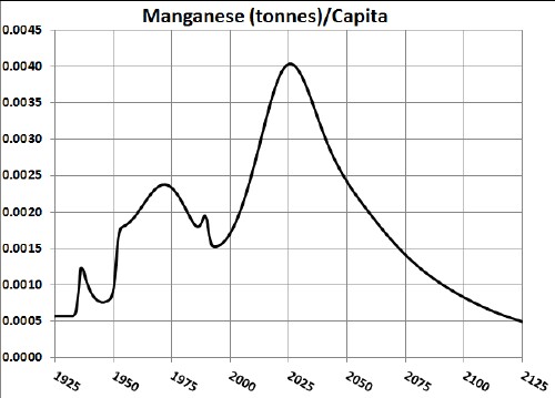 Thus, under the assumptions given above, the effective amount of manganese available for making items peaks at about year 2050 and falls off rapidly after that. Humans will have taken concentrated manganese deposits and scattered them across the surface of the earth.