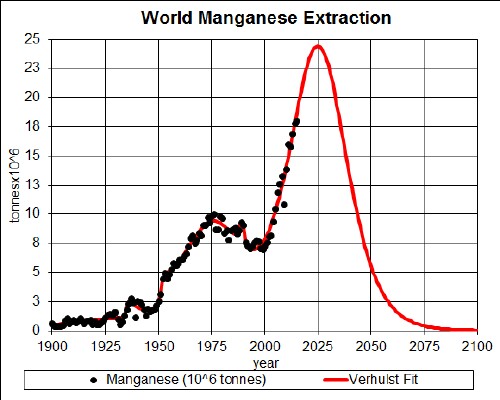 Manganes is used to make stainless steel and aluminum alloys. The graph below shows the manganese extraction data for the world and two Verhulst function fits to the data in order to extrapolate into the future.